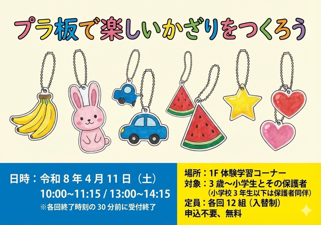 プラ板で楽しいかざりをつくろう 場所:1階体験学習コーナー 開催日 令和8年4月11日(土) 時間 ①10:00-11:15 ②13:00-14:15 各回、終了時刻の30分前に受付終了 対象 3歳~小学生とその保護者 ※小学校3年生以下は保護者同伴 定員 各回12組(入替制) 参加費 無料 申し込み 不要