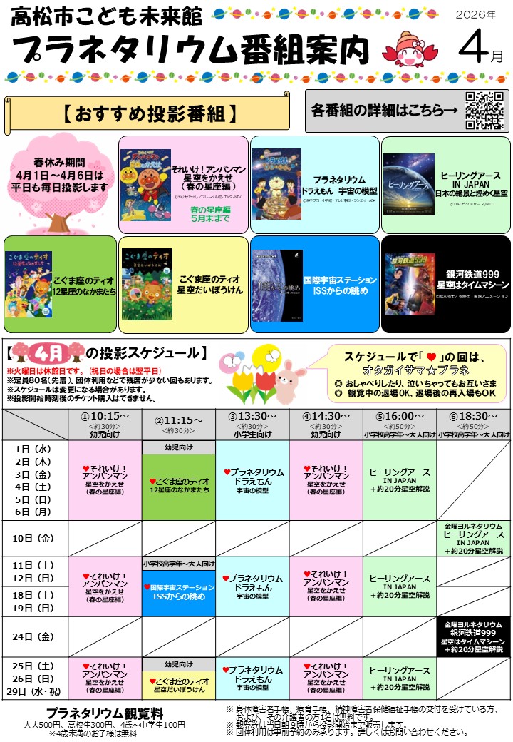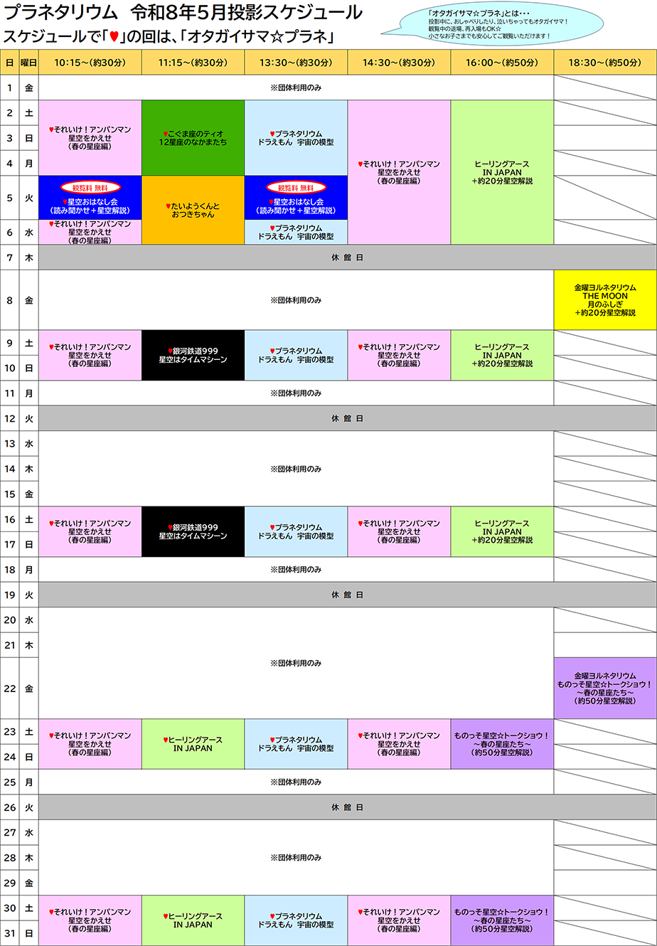 申込:不要(当日投影開始までに、5階プラネタリウム前の券売機にてチケットをお求めください。)